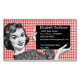 Magnetic business cards featuring a vintage 1950s illustration of a woman holding a sign on a background of red and white plaid. Customize it with your own text. Retro cool!