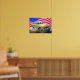 Classic yellow 1955 Chevrolet Bel Air antique automobile photo and American Flag background.