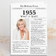 Say happy birthday to someone born in 1955 with this unique Newspaper style birthday card, including a photo of the recipient and a collection of fun facts and world news from the year of their birth. Designed to resemble a vintage newspaper in classic black and white style. A cute and fun way to celebrate the 1950s!