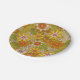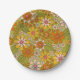These paper plates feature a retro floral pattern, which was inspired by designs from the 1960s and 1970s, with flowers in shades of orange, yellow, pink, and olive green on a green background
