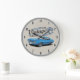 This is a rendering of a blue American classic car with vintage style graphics in the background for a retro look.