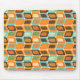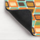 This mouse pad has a mid-century modern design of rounded rectangles leaning to the side with leaning rectangles inside made from lines all in 1970s colors.
