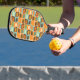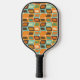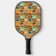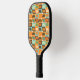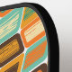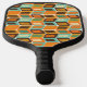 This pickleball paddle has a mid-century modern design of rounded rectangles leaning to the side with leaning rectangles inside made from lines all in 1970s colors.