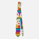 This tie has a design of squares made of rectangles in bright 1970s colors with peace signs scatter around it.