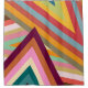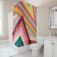 This shower curtain has a 1970s retro design is made from layered upside-down Vs layered in three places all in retro colors.