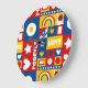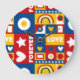 A selection of boxes form a grid with heart, star and geometric shapes to create a vibrant pattern whose message is forever love. Inspired by the colors and retro pop art trend of the 1980s. Bright primary colors of red, blue and yellow with white shapes and text. Design by an independent artist, Rene Dauphine.