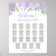 This beautiful 19 table wedding seating chart features a rustic boho chic floral design with a bevy of hand painted watercolor roses, blossoms, and flowers in shades of dusty purple, lavender, and lilac, along with sprigs of eucalyptus leaves and garden greenery. The elegant script calligraphy title reads "Welcome! please find your table" with space for the couple's and wedding date at the bottom. This chart has table assignments for 190 guests at 19 tables with 10 seats per table. Lovely way to add style and charm to your reception while making it easy for your guests to find their seats.