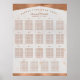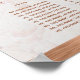 The wedding seating chart has 19 tables. The background is white marble. The upper and lower borders are faux metallic copper, the upper one forms an angle, so that the marble background forms an irregular pentagon.The names of the bride and groom are written in an elegant calligraphic script . All text has a red-brown color like the copper. The text "Please find your seat!" is curved.