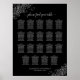 This beautiful wedding seating chart features table assignments for 190 guests, with 10 people at each table. The design is simple yet elegant with pale gray text on a black background. There are lacy silver faux foil curls and swirls in the corners and fancy script calligraphy reading "please find your table."