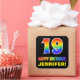 This fun, colorful, and cheerful birthday themed sticker design features a large number "19" and the message "HAPPY BIRTHDAY,", both having a rainbow spectrum gradient inspired pattern coloring, along with a bold yellow custom name. The background is colored black. Fun stickers like this may be used when wrapping a birthday present or gift being given to somebody who is celebrating their 19th birthday, or perhaps may be handed out to the guests at a birthday celebration. [~Z0000480]