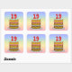 This fun and joyful birthday themed square sticker design features a cartoon-style depiction of a three-tier birthday cake having numeral-shaped candles on top showing the number “19“, along with the message “HAPPY 19TH BIRTHDAY,”, and an editable recipient name. The background has a multicolored pastel rainbow spectrum inspired gradient pattern. Colorful birthday themed stickers like these might be given out or used at a party celebrating somebody’s nineteenth birthday, or perhaps used when preparing invitations or wrapping gifts for such an event. [~Z0000624]