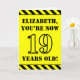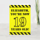 The front of this attention-grabbing and fun birthday-themed greeting card design features an editable name and the message "YOU’RE NOW 19 YEARS OLD!" in black stencil style text on a yellow colored background. There is also an eye-catching black and yellow striped pattern at the top and bottom edges of the front. The inside features an editable birthday greeting message, or could perhaps be cleared and left blank if a message is to be written by hand instead. A customizable birthday card like this might be a fun way to send birthday wishes to somebody who is celebrating their nineteenth birthday. [~Z0000413]