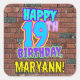 This fun birthday themed square sticker design features the message “HAPPY 19TH BIRTHDAY,” having a vibrant, colorful, graffiti-inspired appearance, plus a personalized recipient name. The background features a pattern inspired by the look of a brick wall. Fun, personalized stickers like this might be given as a birthday present, or used while wrapping presents/gifts, or perhaps used as birthday party decorations when celebrating somebody’s nineteenth birthday. [~Z0000535]