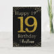 Happy Birthday with simulated golden glitter number 19 set on solid black and framed by faux diamonds and rhinestones. Happy birthday and recipients name in off-white font. Personalize with name or message.