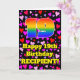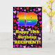 The front of this cheerful and happy birthday greeting card design features a large number “19” with a rainbow spectrum gradient inspired pattern, along with the message “Happy 19th Birthday,”, and a custom name. The background of the front features a pattern of heart shapes with colors like red, purple, and pink. The inside has an editable birthday greeting message, or could perhaps be cleared and left blank if a message is to be written by hand instead. A cheerful, customized birthday greeting card like this might be a fun way to send birthday greetings to somebody who is celebrating their nineteenth birthday. [~Z0000551]