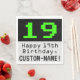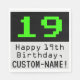 This geeky and nerdy birthday-themed paper napkin design features a large green 8-bit computing style number "19" on a black colored background. It also features the birthday greeting message "Happy 19th Birthday,", and a name that can be personalized. Fun, customizable paper napkins like this might be used at a party being held to celebrate somebody’s nineteenth birthday. [~Z0000404]
