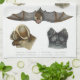 A detailed, hand colored 19th century print depicting illustrations of four different types of bat.