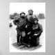19th century photograph depicting three smiling fishermen at a dock along water's edge.