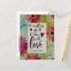 Postcard with inspirational quote Christian scripture depicts an abstract floral watercolor with pink and black flowers on a green background. It features a beloved Bible Verse from 1 Corinthians 16 14, "let everything you do be done with love." The inside scripture from John 15:12, "Love one another as I have loved you." The greeting, prayer can be personalized or deleted for a hand written message.