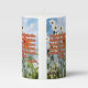 This pillar candle showcases a design that features a Saira Condensed print font with green letters orange colored outline featuring the "1 John 3:8" KJV bible scripture verse over this picture with an upclose view of a field of flowers with white petals green stems under a cloudy light blue sky in the background of this faith based theme. This verse is referencing the Book Of 1 John 3rd chapter showing the 8th verse in this bible scripture quote theme from the King James bible. The candle is covered with a beautiful full-color wrap hand poured, individually designed made with high grade American paraffin & beeswax and, burns approximately 40 hours made in the USA.