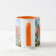 This two-tone mug showcases a design that features a Saira Condensed print font with green letters orange colored outline featuring the "1 John 3:8" KJV bible scripture verse over this picture with an upclose view of a field of flowers with white petals green stems under a cloudy light blue sky in the background of this faith based theme. This verse is referencing the Book Of 1 John 3rd chapter showing the 8th verse in this bible scripture quote theme from the King James bible. The rim & handle are glazed in matching colors available in 11-ounce or 15-ounce sizes microwave and dishwasher safe ceramic construction.