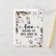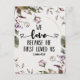 Inspirational quote scripture postcard depicts a simple floral design with white and lilac flowers and leaves. It features Bible Verse 1 John 4:19, "We love because He first loved us."