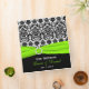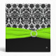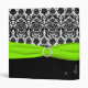 This black and white damask wedding planner binder, photo album, or guest book has a chartreuse green FAUX ribbon and jewel brooch. If you would like matching guest book stationery, or if you need any assistance customizing this with your own information, please email niteowlstudio@gmail.com for help.