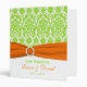 This lime green and white damask wedding planner binder, photo album, or guest book has an orange FAUX ribbon and jewel brooch. If you would like matching guest book stationery, or if you need any assistance customizing this with your own information, please email niteowlstudio@gmail.com for help.