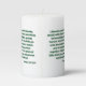 This pillar candle shows a neue machina ultrabold print font with green letters displaying the "1 Peter 3:7 KJV" bible scripture verse over a white background. This verse is referencing the Book Of 1 Peter 3rd chapter showing the 7th verse in this bible scripture quote theme from the King James bible. The candle is covered with a beautiful full-color wrap hand poured, individually designed made with high grade American paraffin & beeswax and, burns approximately 40 hours made in the USA.