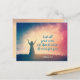 Beautiful inspirational quote scripture custom postcard depicts a women in a field with her hands lifted to the Lord. It features Bible Verse 1 Peter 5:7, Cast all your cares on him because he cares for you.*_