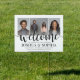 It's a double graduation party! Add a personalized touch to a joint graduation celebration honoring two graduates with a 3 photo collage welcome yard sign. The pictures and wording are simple to customize and colors are easy to change with the Zazzle design tool. The template includes class year, school name, and customizable messages that read "welcome to a graduation party" and "thank you for celebrating with us." (IMAGE PLACEMENT TIP: An easy way to position a photo exactly how you want is to crop it before uploading to the Zazzle website.) The modern black and white design features handwritten style script calligraphy, elegant classic typography, and three photos of your choice, such as senior pictures or images from the commencement ceremony. This outdoor welcome sign is a stylish way to announce a special day celebration for any 2 grads, such as siblings, best friends, cousins, twins, brother and sister, etc. Congratulations to both of the graduates!