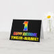 The front of this colorful, cheerful, and fun birthday-themed greeting card design features a large number "1" and the message "HAPPY BIRTHDAY,", both colored with a rainbow spectrum gradient inspired pattern, along with a bold yellow editable recipient name. The front also features a minimalist, plain, black colored background. The inside has a personalized birthday greeting message, or could perhaps be cleared and left blank if a message is to be written by hand instead. A cheerful personalized birthday card like this might be a fun way to acknowledge somebody’s first birthday. [~Z0000472]