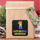 This cheerful, fun, and colorful birthday sticker design features a large number "1" and the message "HAPPY BIRTHDAY,", both colored with a rainbow spectrum gradient inspired pattern, along with a bold yellow personalized name. The background is colored black. Fun stickers like this could be used when wrapping a birthday present or gift being given to somebody who is celebrating their 1st birthday, or might be given out to the guests at a birthday party or celebration. [~Z0000480]