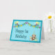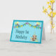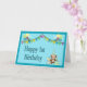 A Cute 1st Birthday Card in two-toned aqua that features a Monkey in a Birthday Hat with a cake and one candle, multi-colored balloons and pennants. Design ©2013 Kreative Sentiments Cards by Sherry Harris