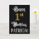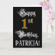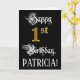The front of this elegant and luxurious birthday-themed greeting card design features the message “Happy 1st Birthday,”, and a personalized recipient name. Part of the message is in a fancy script-style text, the large number “1st” has a faux/imitation gold-inspired look pattern, and the background is colored black. The inside has a customizable birthday greeting message, or could perhaps be cleared and left blank if a message is to be written by hand instead. A formal, personalized birthday greeting card like this might be a respectable way to send some birthday wishes to somebody who is celebrating their first birthday. [~Z0000559]