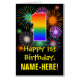 The front of this cheerful, joyful, and vibrant birthday greeting card design features a large number “1” having a rainbow spectrum gradient inspired pattern. It also features the message “Happy 1st Birthday,”, and a personalized recipient name. The front additionally has a colorful bursting celebratory fireworks inspired background pattern. The inside features a customized birthday greeting message, or could perhaps be cleared and left blank if a message is to be written by hand instead. A customizable birthday card like this might be a fun way to acknowledge somebody’s first birthday. [~Z0000526]