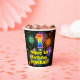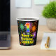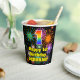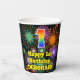 This colorful and cheerful birthday-themed paper cup design features a large number “1” with a rainbow spectrum gradient inspired pattern, along with the message “Happy 1st Birthday,”, and a personalized name. The background features a vibrant and colorful bursting celebratory fireworks inspired pattern. Colorful, vibrant paper cups like this might be fun to use at a birthday celebration being held in celebration of somebody’s first birthday. [~Z0000539]