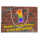 This colorful and fun birthday gift bag design, inspired by graffiti and street art, features a large number "1" having a rainbow spectrum gradient inspired pattern. It also features the message "Happy 1st Birthday,", and a customizable name. The background features a brick wall inspired pattern. A birthday themed giftbag like this might be a fun way to wrap a gift or present being given to somebody who is celebrating their first birthday. [~Z0000522]