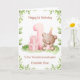 This watercolour 1st birthday card is suitable for a granddaughter or daughter. The design includes a greenery border, a birthday number 1 in pink, and a teddy bear with birthday balloon, gifts and party hat. Child's name is included on the front of the card.