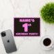 The front of this bold and fun first birthday celebration/party foil invitation card features a customizable name, a large number “1st”, the message “BIRTHDAY PARTY!”, and a border, all featuring a girly dark pink and light pink lines pattern. The back features personalized details about the event, such as the date, time, venue/location, and any other information that may be useful. Customizable invitations like these might be used to invite attendees to a birthday gathering/party being held to honor somebody’s 1st birthday. [~Z0000597]