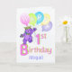 A purple teddy bear princess dressed up in a lovely yellow jeweled crown and pink, blue and green flowers is dancing on the Birthday B and holding a bunch of colorful balloons with the word HAPPY on them. This happy birthday card will bring a smile to a special girl on her 1st birthday. Personalize with her name on card front and inside verse to make it extra special. Original design by Anura Design Studio.