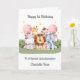 This 1st birthday card is suitable for a granddaughter or daughter. The design includes the number 1, two pink birthday balloons, and five watercolour safari animals - hippo, giraffe, lion, monkey and elephant.