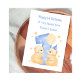 This watercolour twins 1st birthday card is for boys. The design includes birthday stars, a polka dot number 1 in blue, a birthday balloon, and two teddy bears. The children's names have been included on the front of the card.