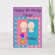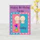 Birthday card for your special little twins first birthday. On the front is a big multi coloured number 1. Below the one is two little twin babies in a white nappies and a big smiles. This cute picture is in an pink and blue frame with white stars all the way round. Over the top are the words "Happy Birthday Twins in dark lettering. Inside are the words, "Wishing our special little twins a very happy birthday" All is in a template that you can delete or change to your own text.