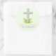 Pearl white cross on leafy greens on a pale mint green background Sticker! Perfect design for First Communion, Baptism, Christening, Dedication party favors stickers and more. MATCHING items in our store.