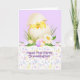 First Easter card for Granddaughter with flowers on the bottom and lavender on the top with a baby chick peeking out of an egg and "Happy First Easter Granddaughter" in purple on the bottom. Some original artwork©delightful-doodles.com