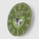 Peridot heart wedding anniversary clock in olive green hues. Personalize this clock with your own couples photo, year of marriage, and names or relationship to you. The example reads Jasmina and Jonny Robinson 1st Peridot Wedding Anniversary and your marriage and your anniversary year. The green peridot gemstone is the modern jewelry gift for a 1st-anniversary, symbolizing opening up your heart, attracting love and happiness in abundance, promoting family harmony, and giving good luck. Other matching peridot heart items are also available. Green peridot effect graphic art and design by Sarah Trett for www.mylittleeden.com