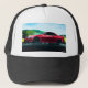 this cool and comfy 2 tone trucker cap features a beautiful 2000's sports car with a stunning rocket high speed octane affect to it along a roadside with a nature background!