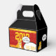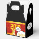 Gable Favor Box with a lovely dog design in front and back (Shiba Inu in brown and white) with speech bubbles for your text (Here Happy New Year) + Wishes in Vietnamese (text image) on red fabric image and golden textured background + in lateral sides another puppy: with love + in other speech bubble: The Name Family. . You can easily add and change text + background color (here balck) by clicking the customize button. Perfect for Vietnamese New Year of the Dog 2018 or birthday (people born in Dog Year).