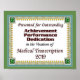 Certificate of Achievement for Medical Transcriptionists. Perfect for Outstanding MTs or Graduating Student MTs.